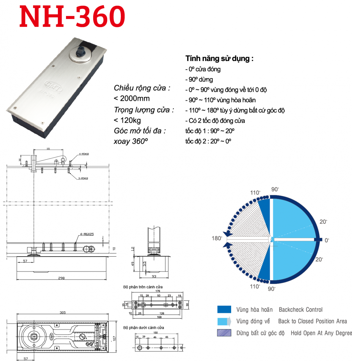 - Bản lề sàn xoay hiệu GMT loại xoay 306 độ mã NH -360 có ngoại hình hẹp, thực hiện nâng cấp thay thế dễ dàng so với bản lề sàn truyền thống.