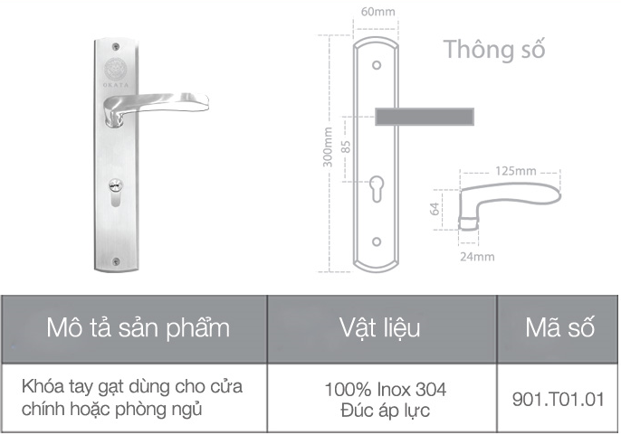 Khóa gạt cửa đi OKATA 901-T01-01 - Khóa gạt cửa đi OKATA 901-T01-01 được đúc từ nguyên liệu inox SUS 304 sử dụng công nghệ đúc áp lực. Sản phẩm của thương hiệu OKATA được đúc áp lực giúp cho sản phẩm có khả năng chịu lực rất tốt, chống gẫy, móp méo...