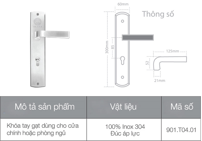- Khóa inox đúc OKATA 901-T04-01 được đúc từ nguyên liệu inox SUS 304 sử dụng công nghệ đúc áp lực. Sản phẩm của thương hiệu OKATA được đúc áp lực giúp cho sản phẩm có khả năng chịu lực rất tốt, chống gẫy, móp méo khi có va đập mạnh. Khóa inox đúc OKATA 901-T04-01 dùng cho cửa đi chính