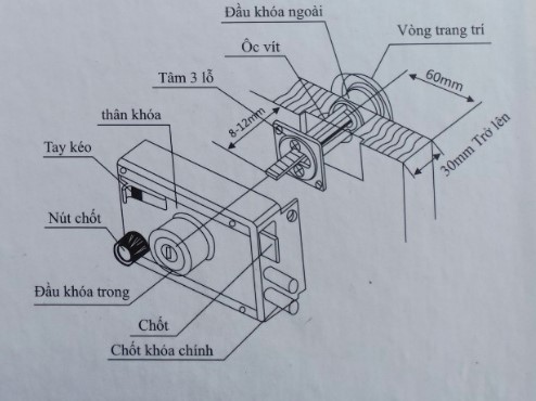 1. Căn cứ vào hướng mở của cửa, ở mép cửa với cự li 60mm khoan 1 lỗ tròn phi 30mm ở vị trí thích hợp. Sau đó lắp giá đỡ thanh khóa, sao cho khóa sau khi lắp thân khóa mép và mép cửa cân bằng.