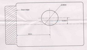 • Dùng template đính kèm để xác định vị trí cần lắp đặt thân khóa, và khoảng cách từ mép cửa (door edge) đến tâm ruột khóa (hình vẽ) là 60mm
