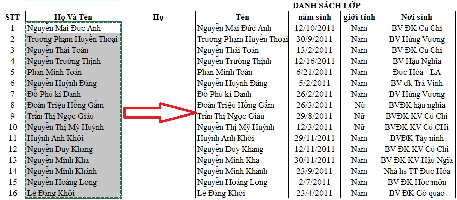 Bước 1: Cắt riêng tên từ cột họ và tên: Tạo thêm 2 cột bên cạnh cột Họ và tên (đặt tên cột Họ và cột Tên) copy toàn bộ dữ liệu ở cột Họ sang cột Tên.