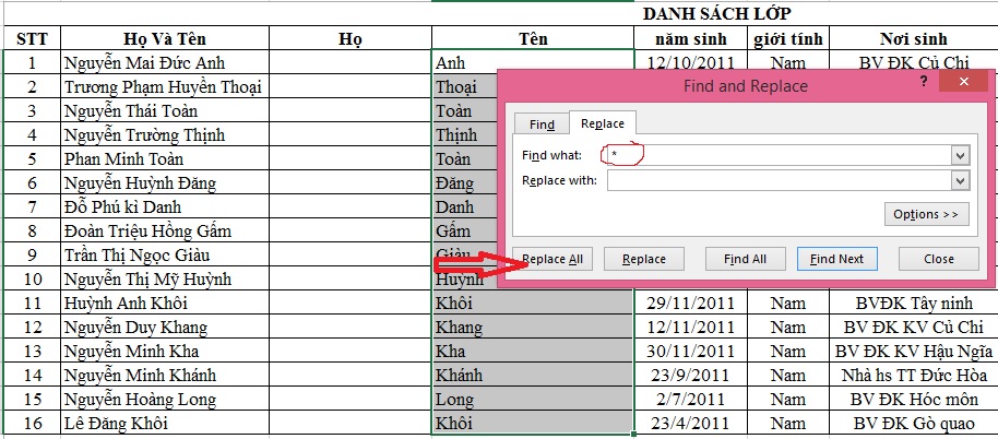 Bước 2: Lựa chọn toàn bộ cột Tên, nhấn tổ hợp phím Ctrl + H.