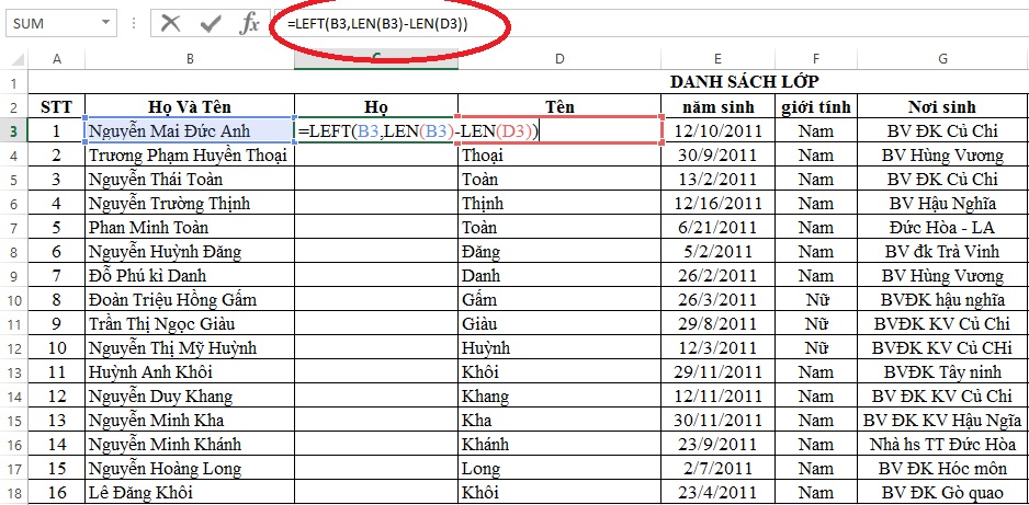 Bước 3: Sử dụng hàm left() và hàm Len() để lấy giá trị Họ và Tên lót. Tại cột Họ nhập câu lệnh sau: =LEFT(B3,LEN(B3)-LEN(D3))