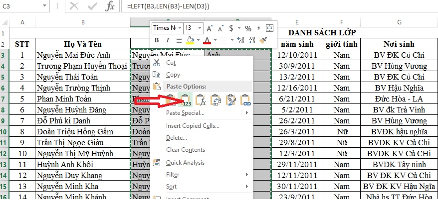 Bước 4: Copy toàn bộ cột Họ và cột Tên -> chọn Paste Value lại vào vị trí hiện tại.