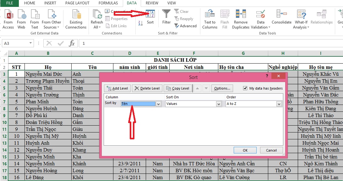 Hướng dẫn sắp xếp tên theo thứ tự abc trong Excel