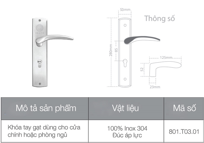 - Khóa gạt cửa gỗ OKATA 801-T03-01 được đúc từ nguyên liệu inox SUS 304 sử dụng công nghệ đúc áp lực. Sản phẩm của thương hiệu OKATA được đúc áp lực giúp cho sản phẩm có khả năng chịu lực rất tốt, chống gẫy, móp méo khi có va đập mạnh. Khóa gạt cửa gỗ OKATA 801-T03-01 dùng cho cửa chính và cửa phòng ngủ